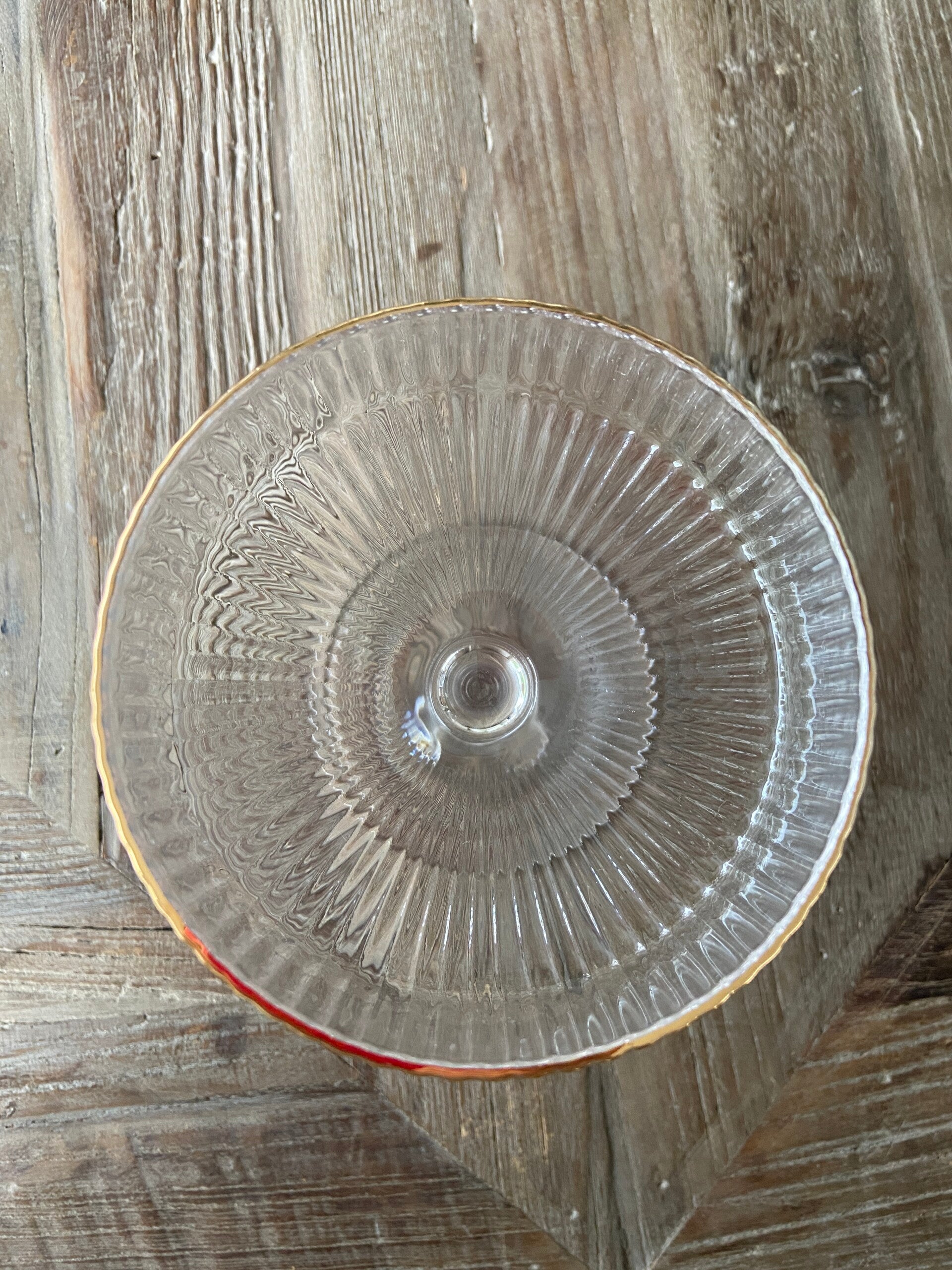 Prachtige verfijnde champagne- of coctail glazen in geslepen glas met gouden randje, ideaal voor al uw feesten of een glaasje in de zon...