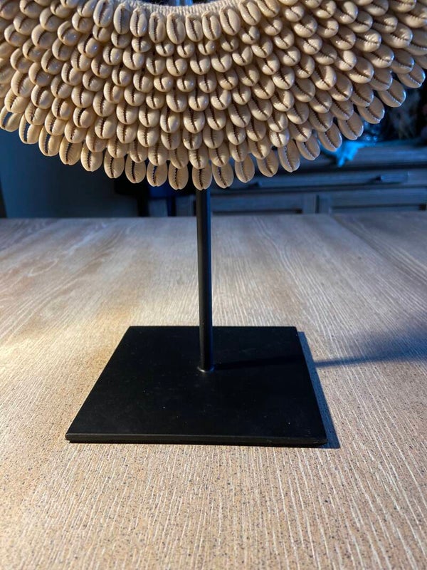 Majestueuse grote schelpenring met witte kauri's op zwarte staander. Staat geweldig in elk interieur ! Met de hand geknoopt in Bali.