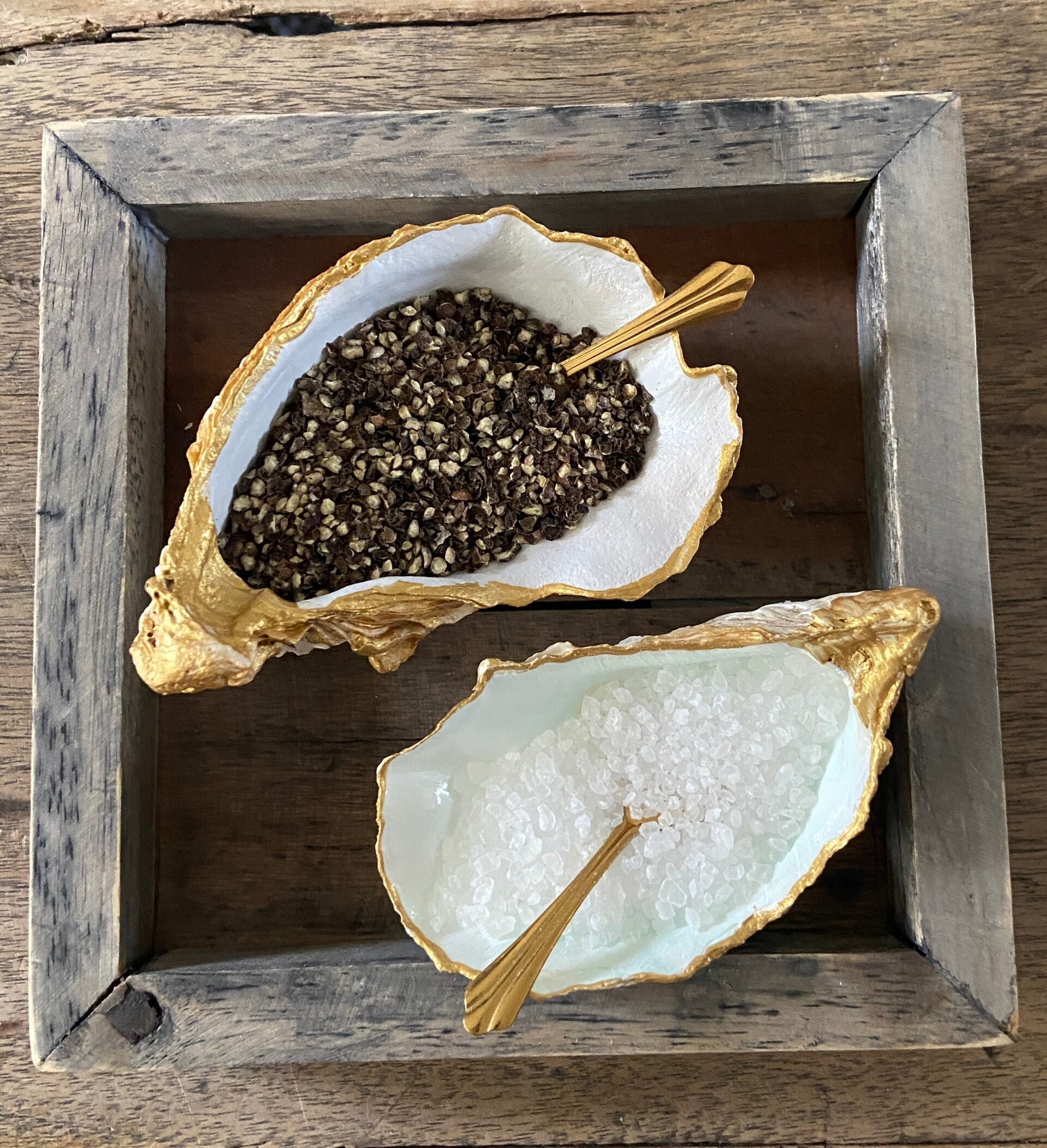 Zout en peper set in 2 oesterschelpen (gevuld met Sal de Ibiza zout en groffe peper). Deze set bestaat uit 2 gedecoreerde schelpen voedselveilig vernist en afgewerkt met goudverf, houten vierkante onderschaal en 2 gouden lepeltjes.