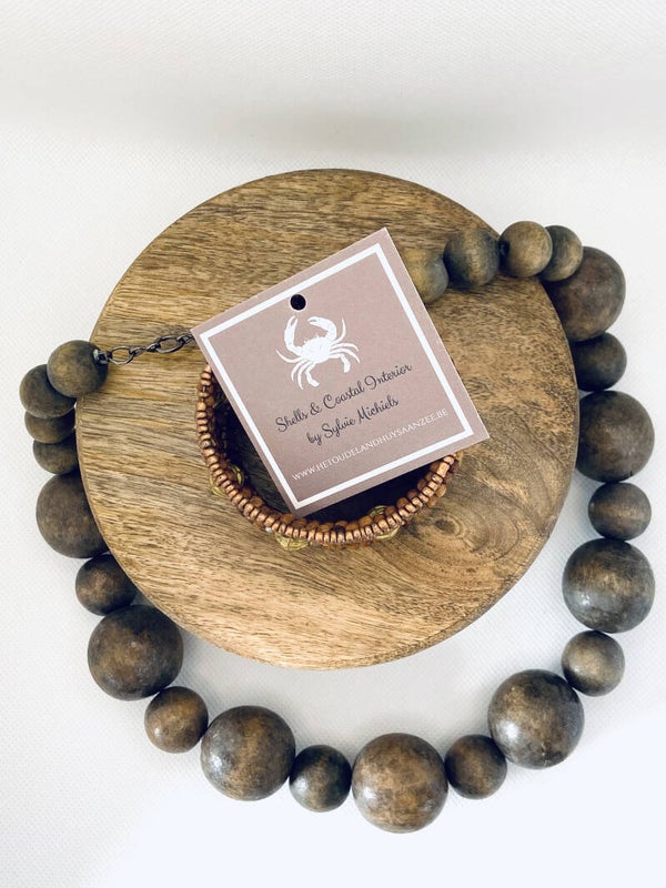 Deze Zanzibar Organic juwelencollectie, gemaakt van houten kralen in vele zomertinten met karabijnsluiting is een topper van formaat ! Ze zijn handmade uit Afrika en prachtig om naar te kijken en aan te raken. Deze draagt kort rond de hals met slotje + ketting om deze langer te maken.