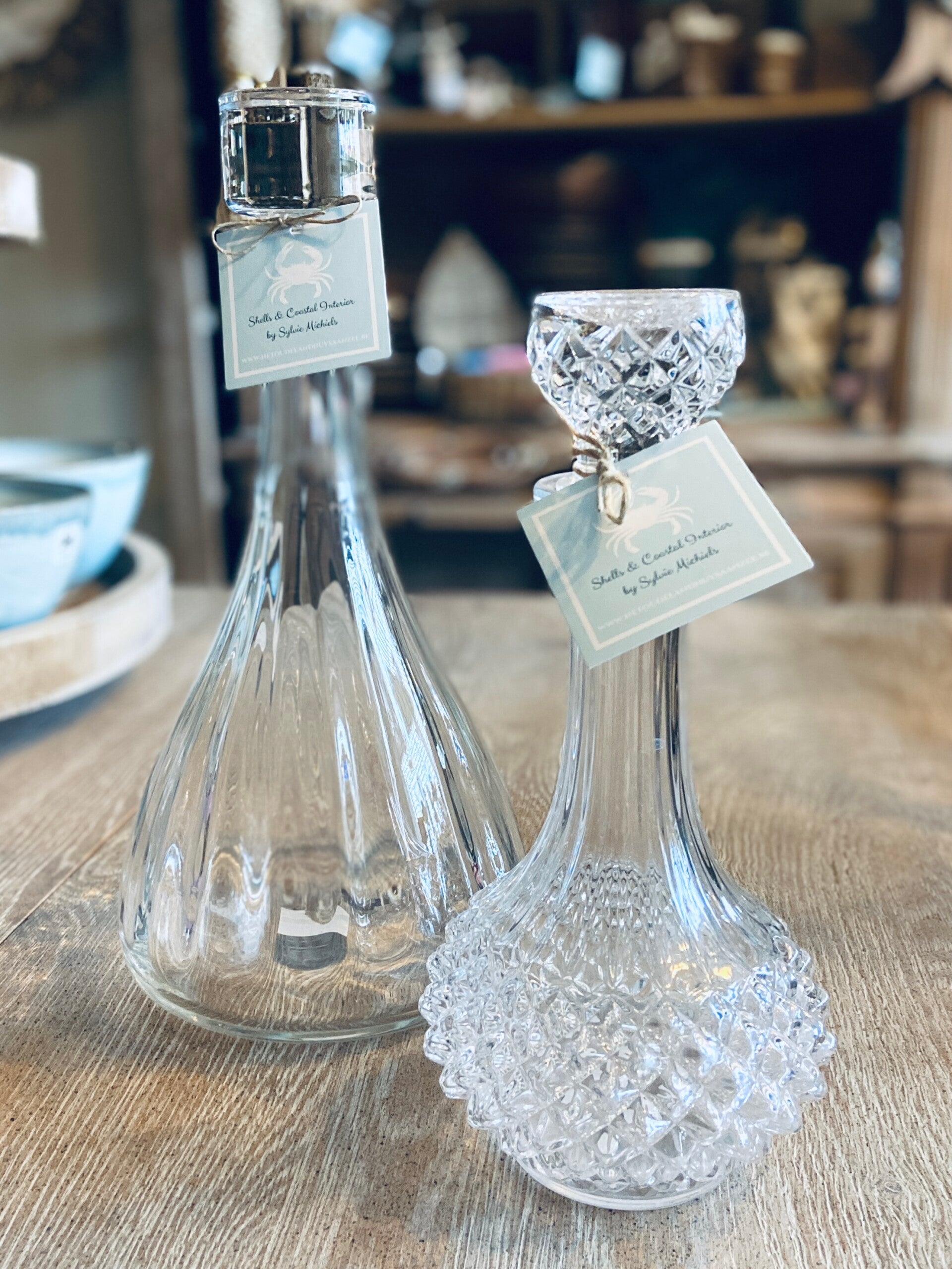 Zeer mooie sfeervolle karaffen met mooie statige afsluitstop, prachtig als ensemble tezamen of apart. Ideaal om sterke drank of bv limoncello in te serveren. Te bewonderen in onze conceptstore.