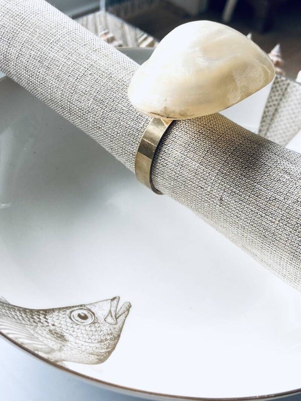 Prachtige dubbele parelmoer Macabebe schelpen op goudkleurige houder als servietring. Een echte eye-catcher voor uw gedekte tafel, geleverd per 4 stuks in een feestelijk organza zakje !