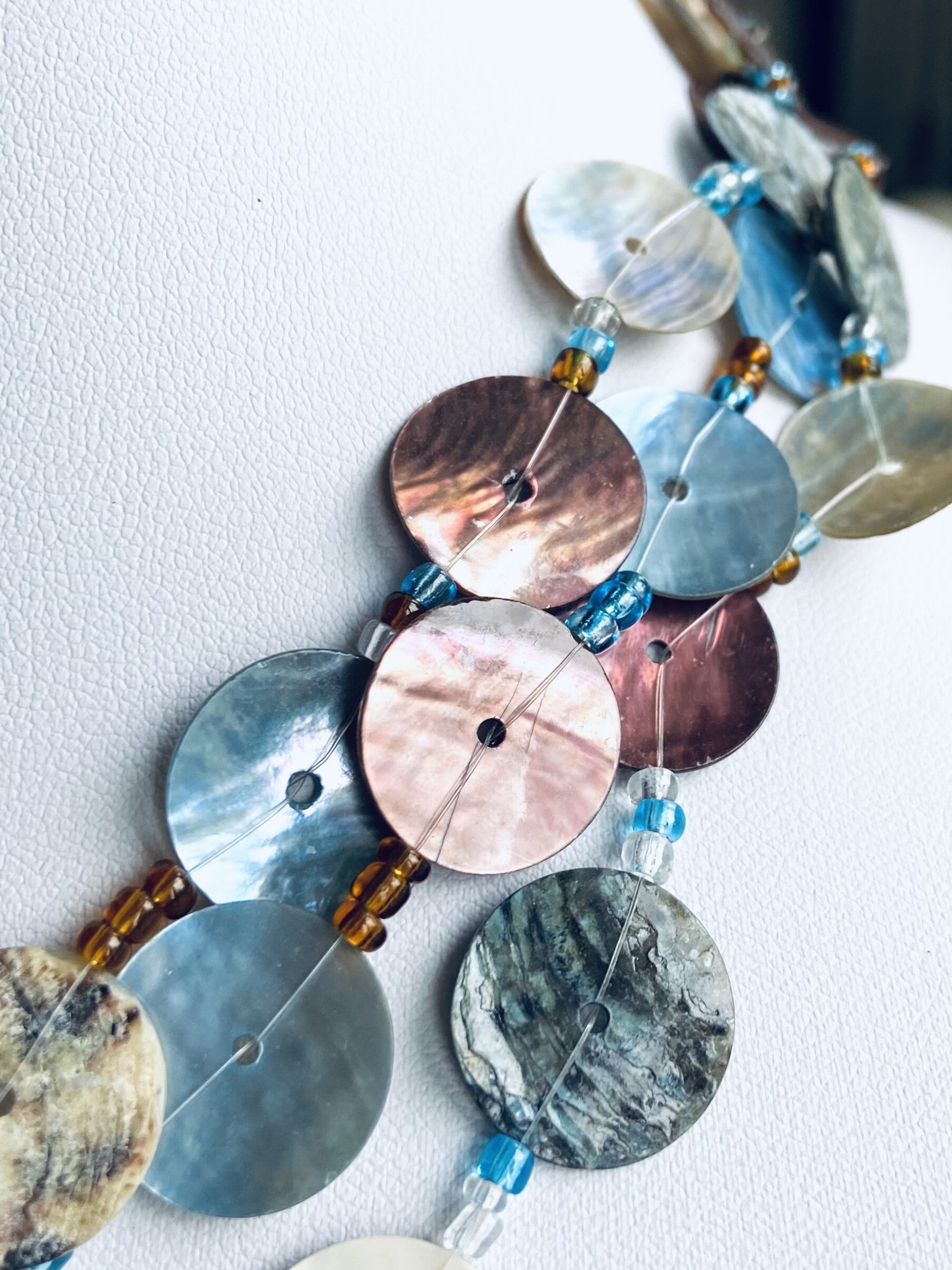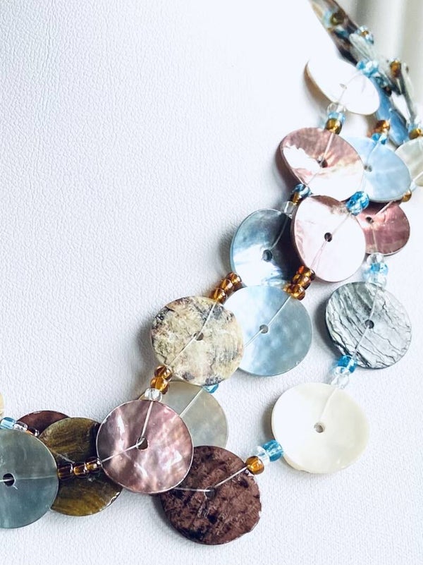 Deze exclusieve collectie Bora Bora is handgemaakt uit schelpen. Het aantal geknoopte rijen schelpenknopen vormt de dikte van uw halsnoer en staat aangeduid per exemplaar.