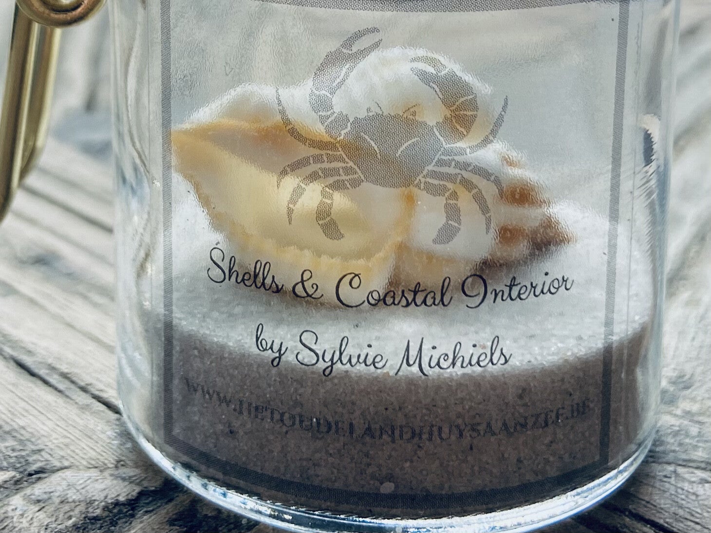 Glazen bokaaltje (HOLAZ gelabeld) met deksel, gevuld met wit zand en unieke schelp. Fantastisch cadeautje om te geven, te krijgen of naar te kijken !