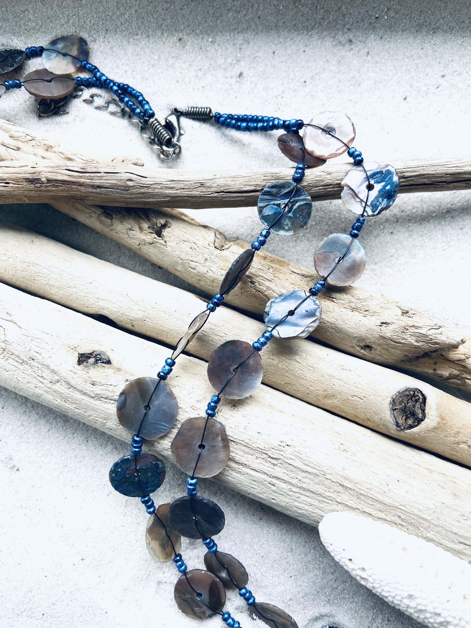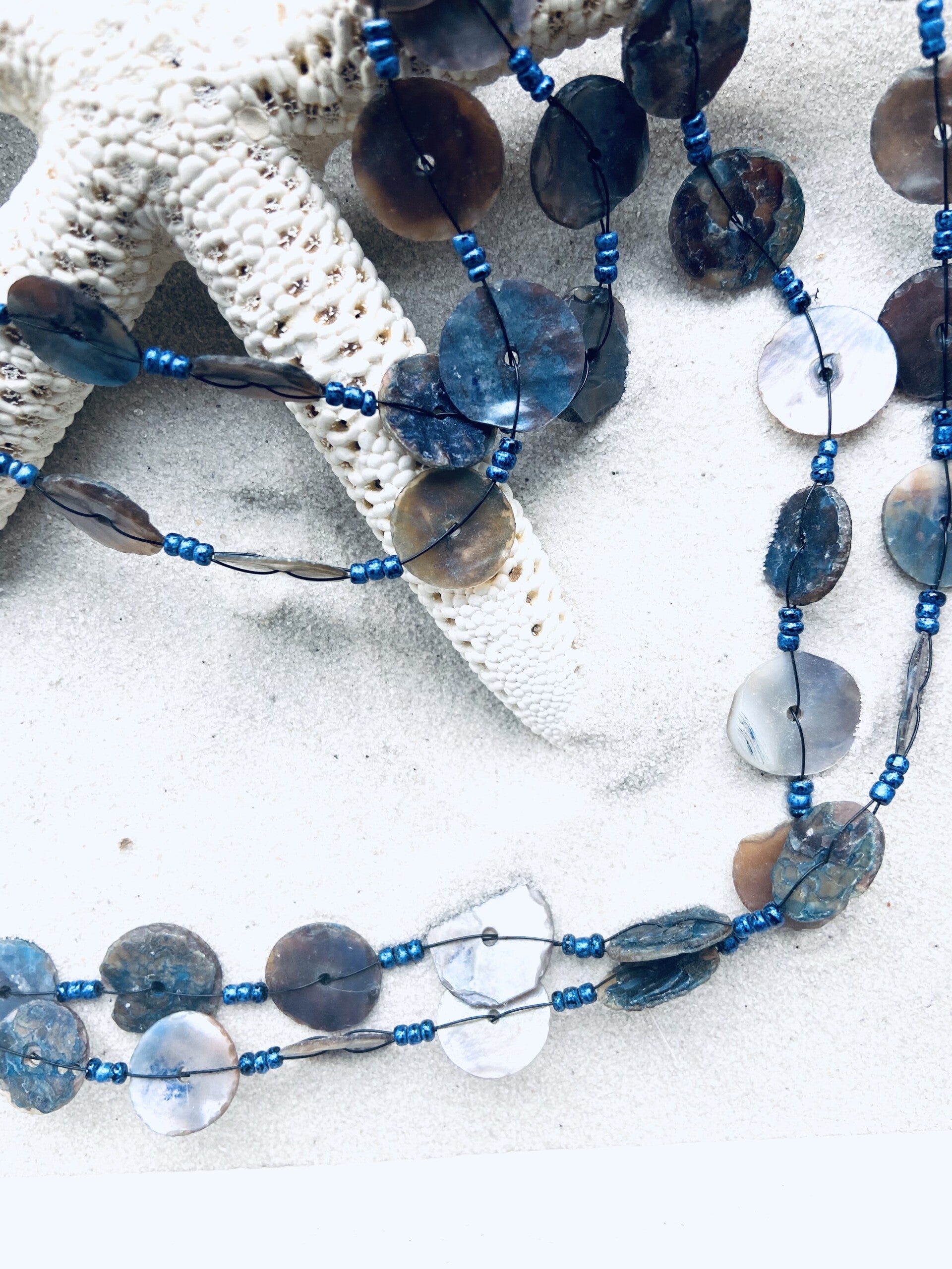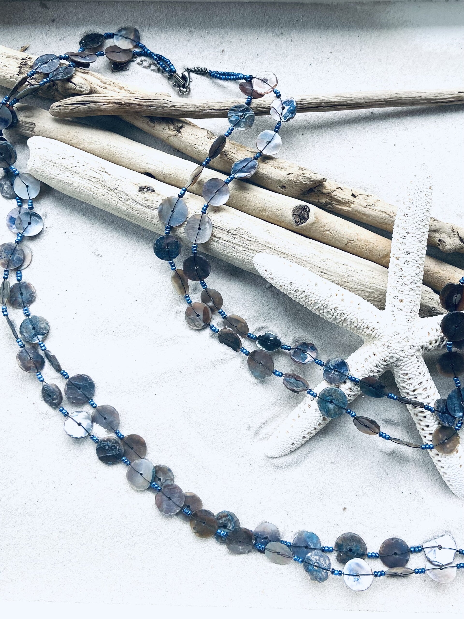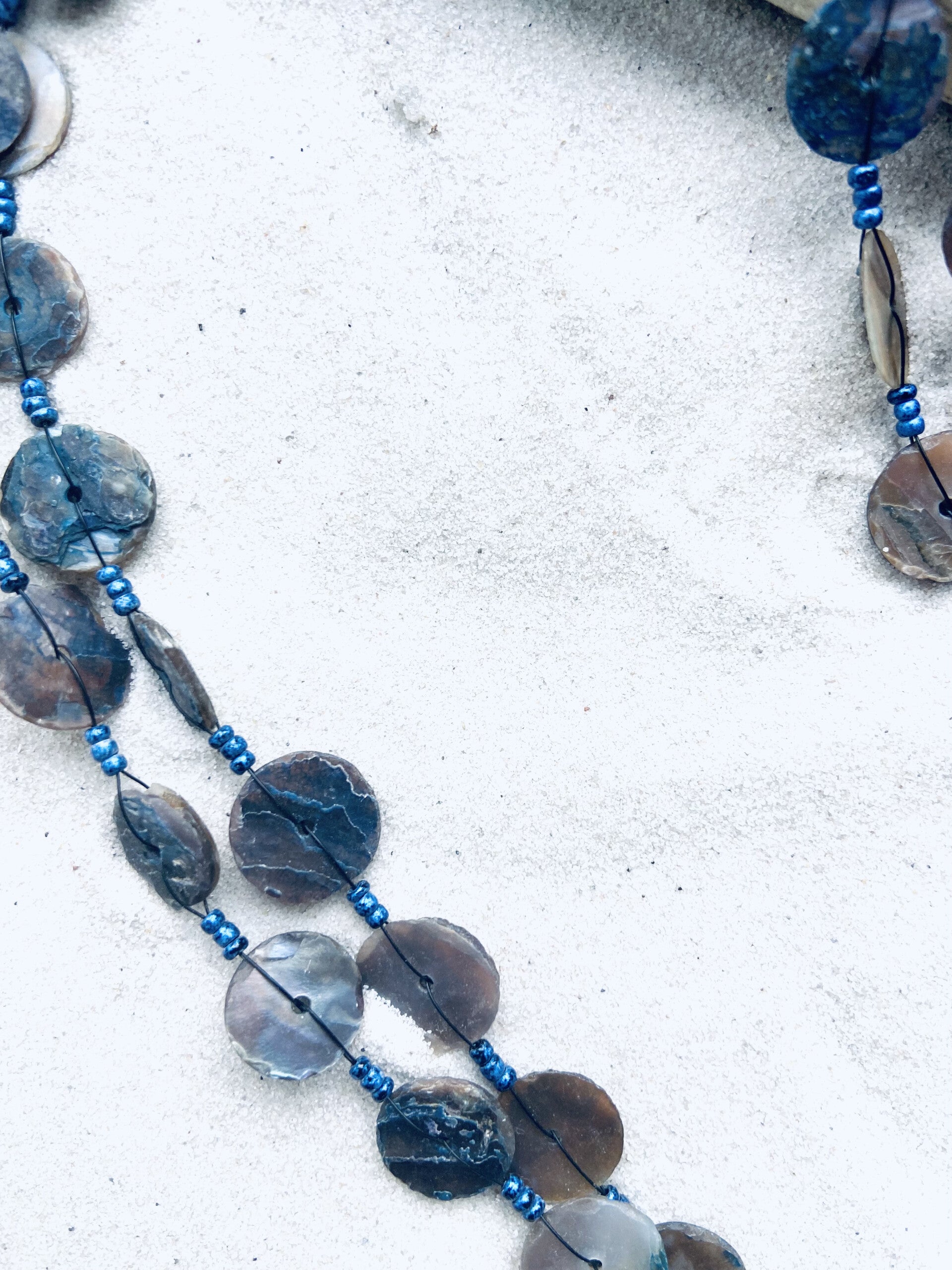 XL halsketting met 2 lange rijen parelmoeren schelpenknopen.