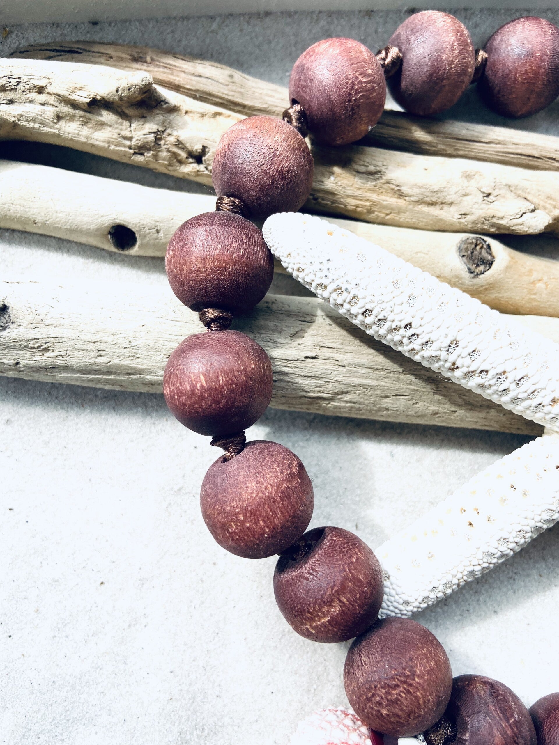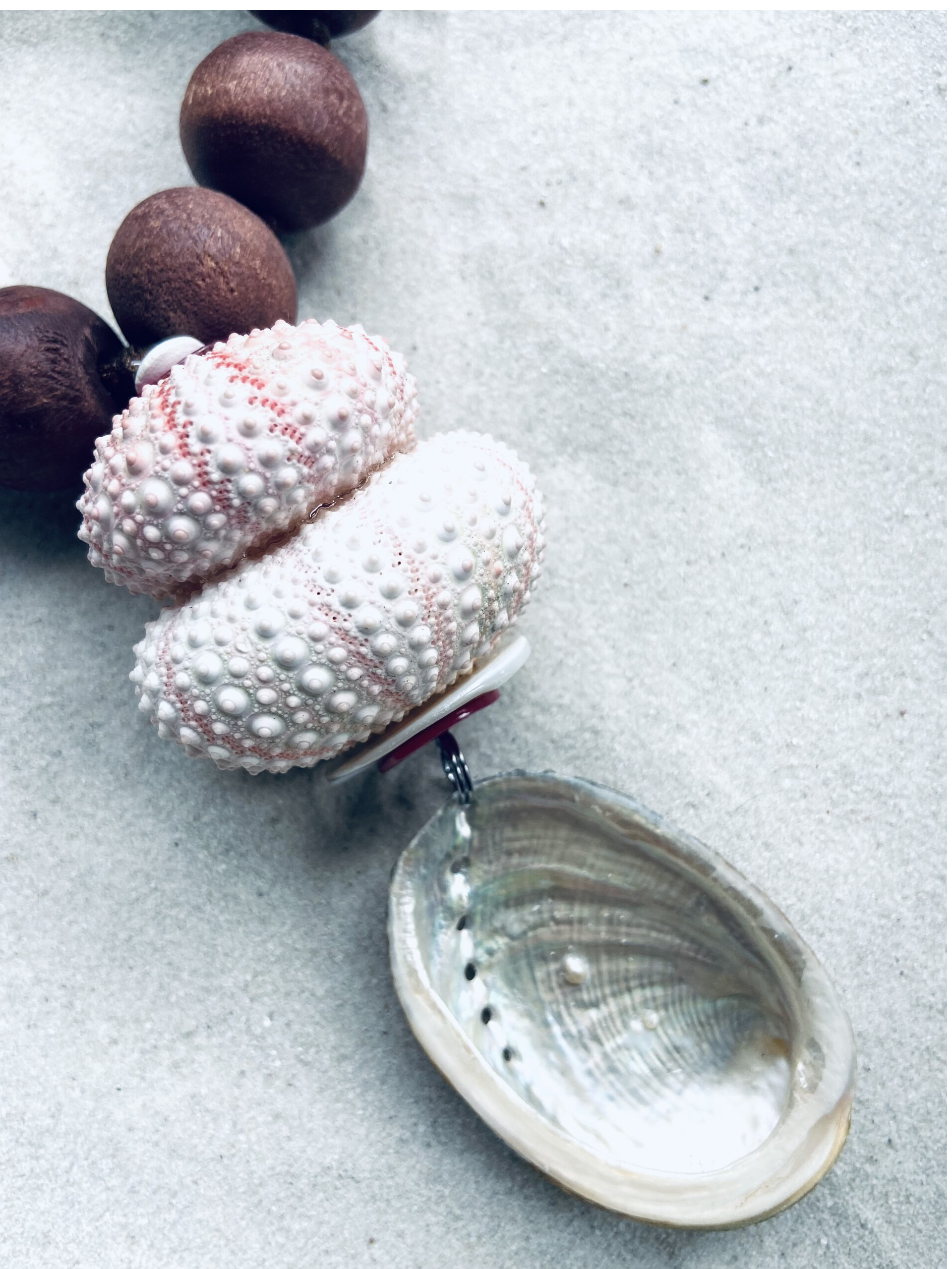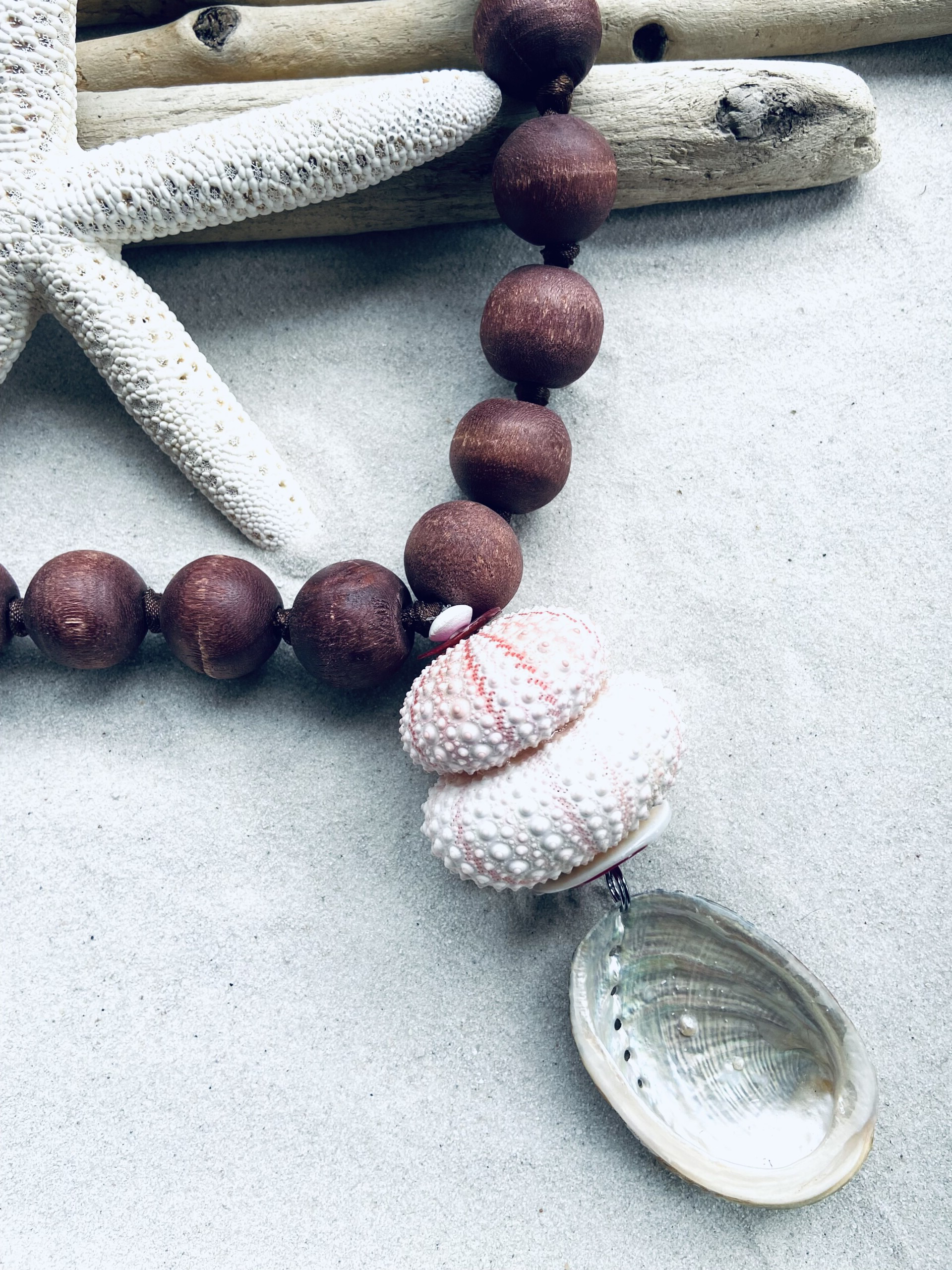 Deze lange halsketting bestaat uit houten kralen, onderaan afgewerkt met twee zeeëgels, parelmoerknopen en abaloneschelp.