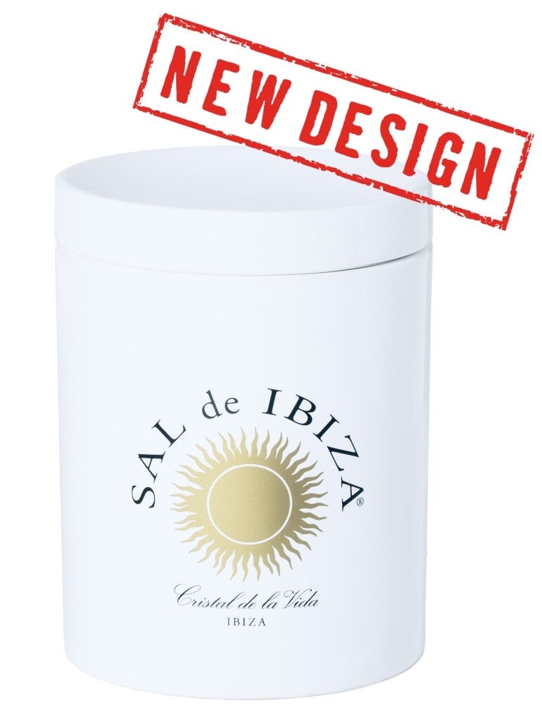Stijlvolle SAL DE IBIZA wit keramische Zoutcontainer/pot 1150g + deksel (met gouden logo). Zout-vullingen grof of fijn zijn los apart verkrijgbaar.