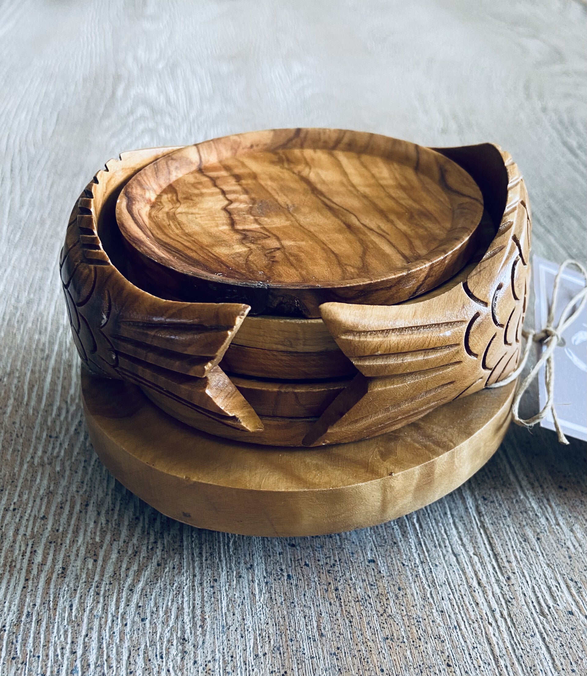 Kom helemaal in de Carraïbische sfeer met deze teakhouten glasonderleggers in vishouder. Super schattig en leuk om cadeau te geven !
