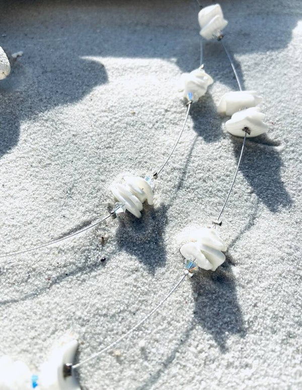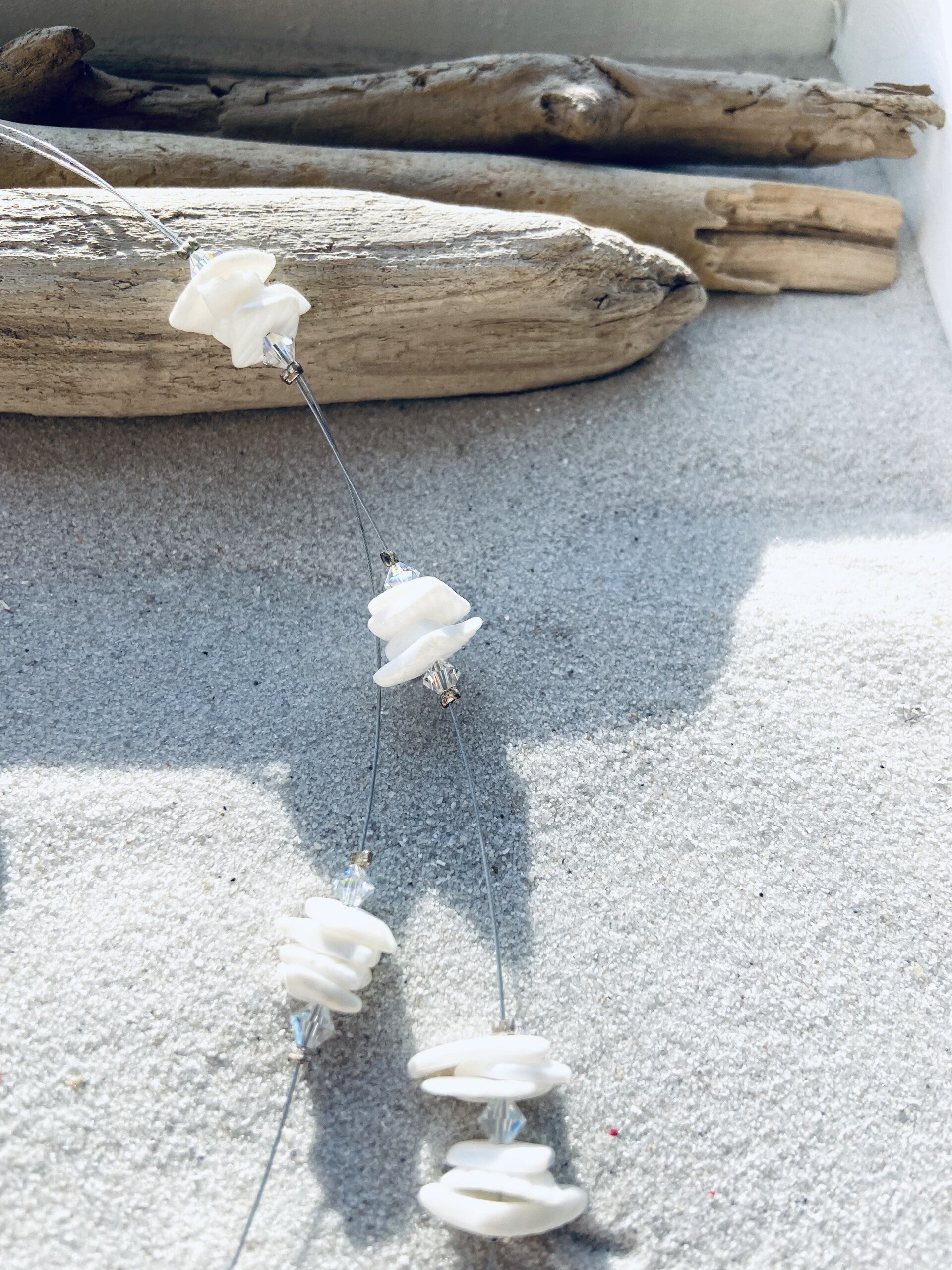 Mooie fijne draadhalsketting met stukjes witte schelp, afgewisseld met kleine swarovski pareltjes. Zeer mooi om een subtiele toets te geven aan uw zomers kleedje !
