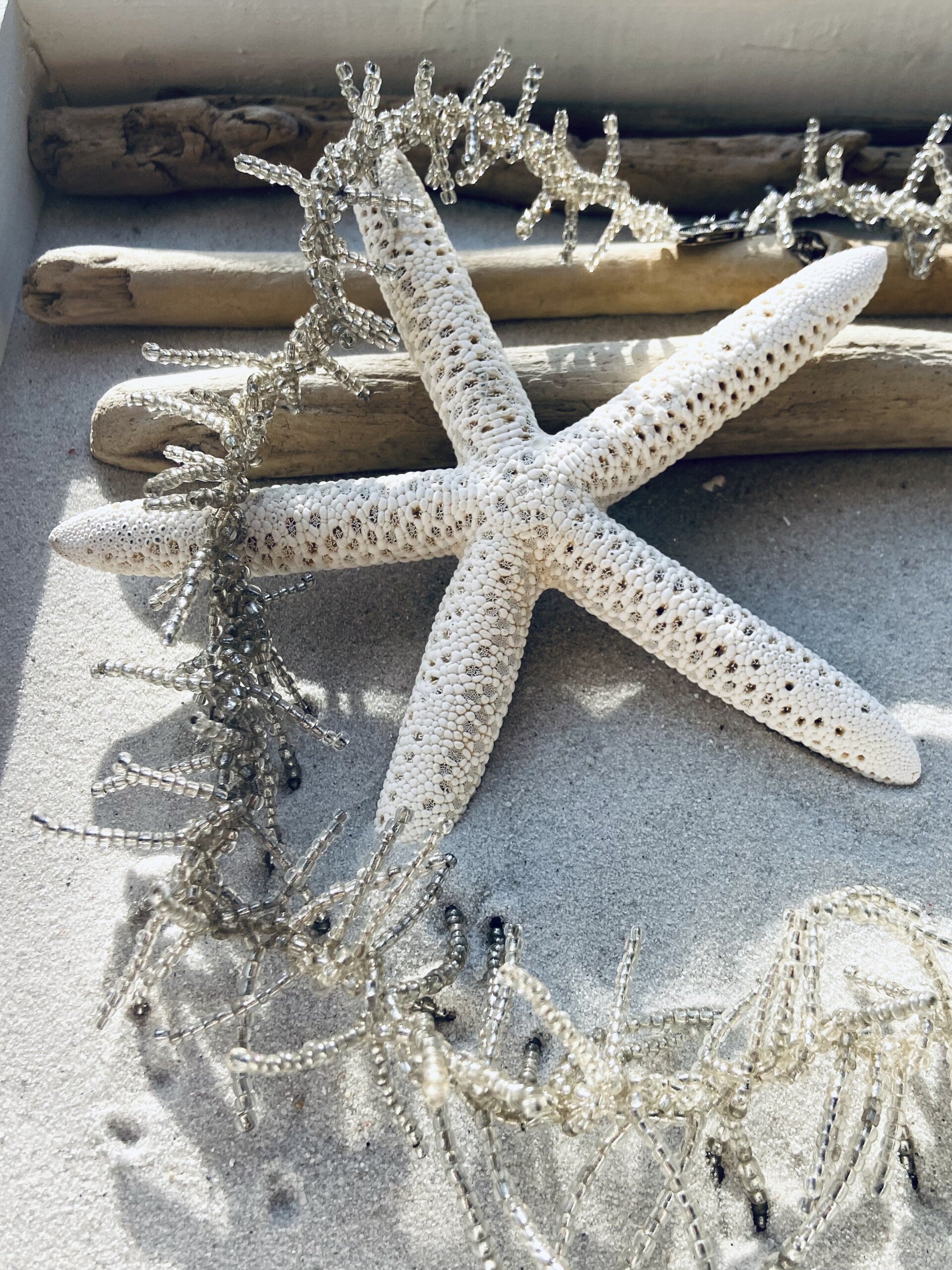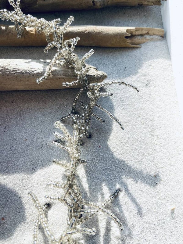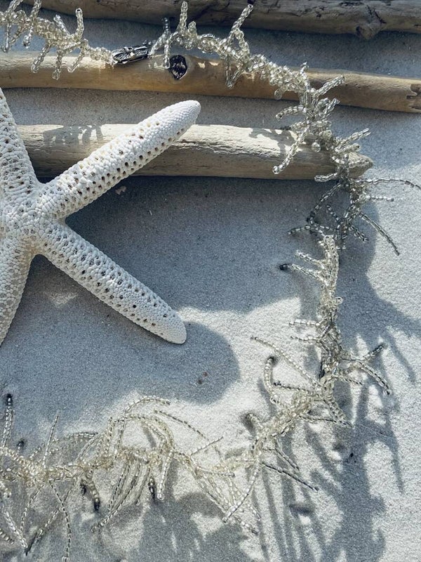 Deze prachtige halsketting, gemaakt uit honderden kleine zilverkleurige pareltjes is een topper van formaat op elk feestje. De koraalvormen geven een speels karakter. Afgewerkt met een speciaal zilveren slotje.