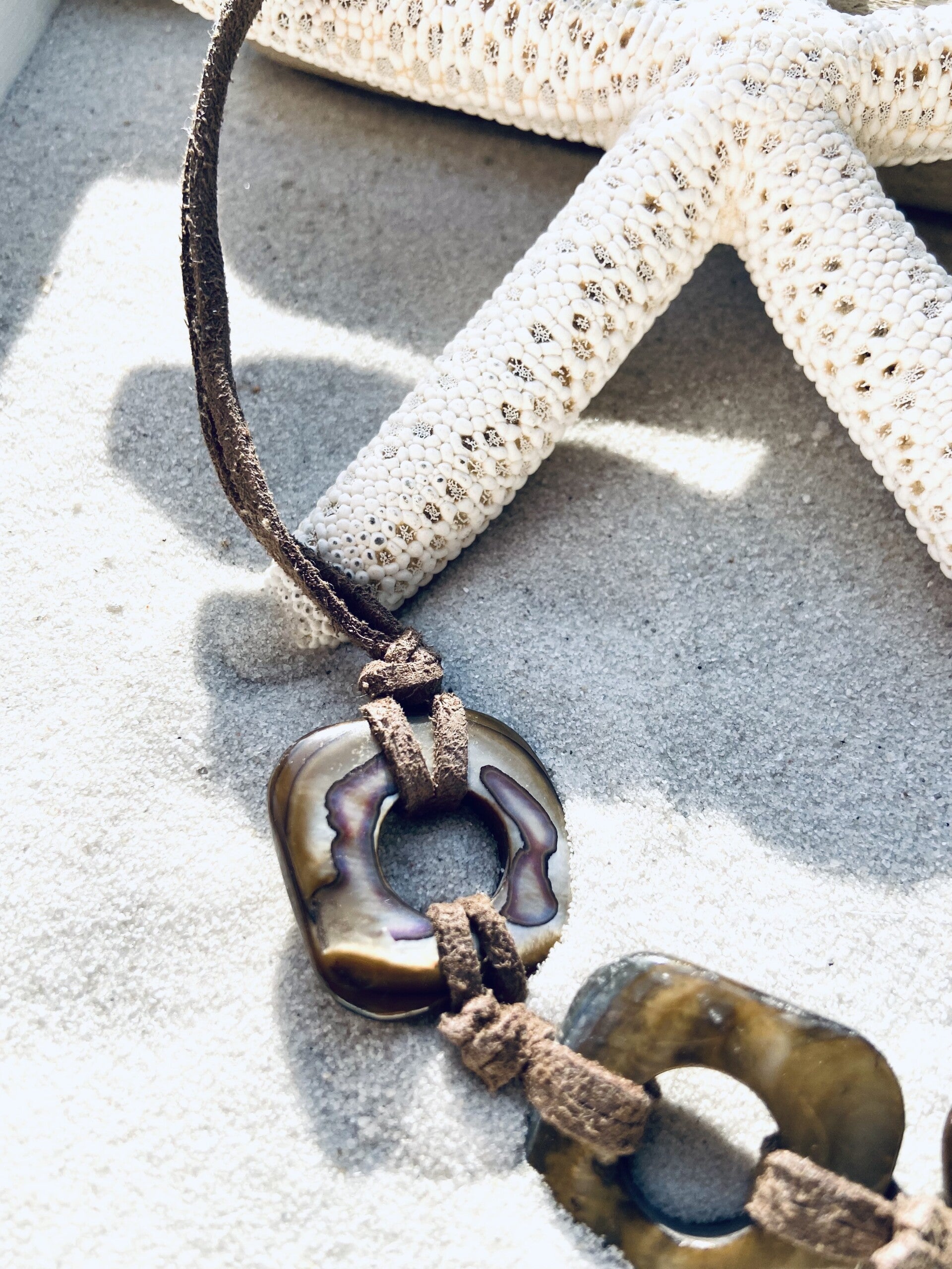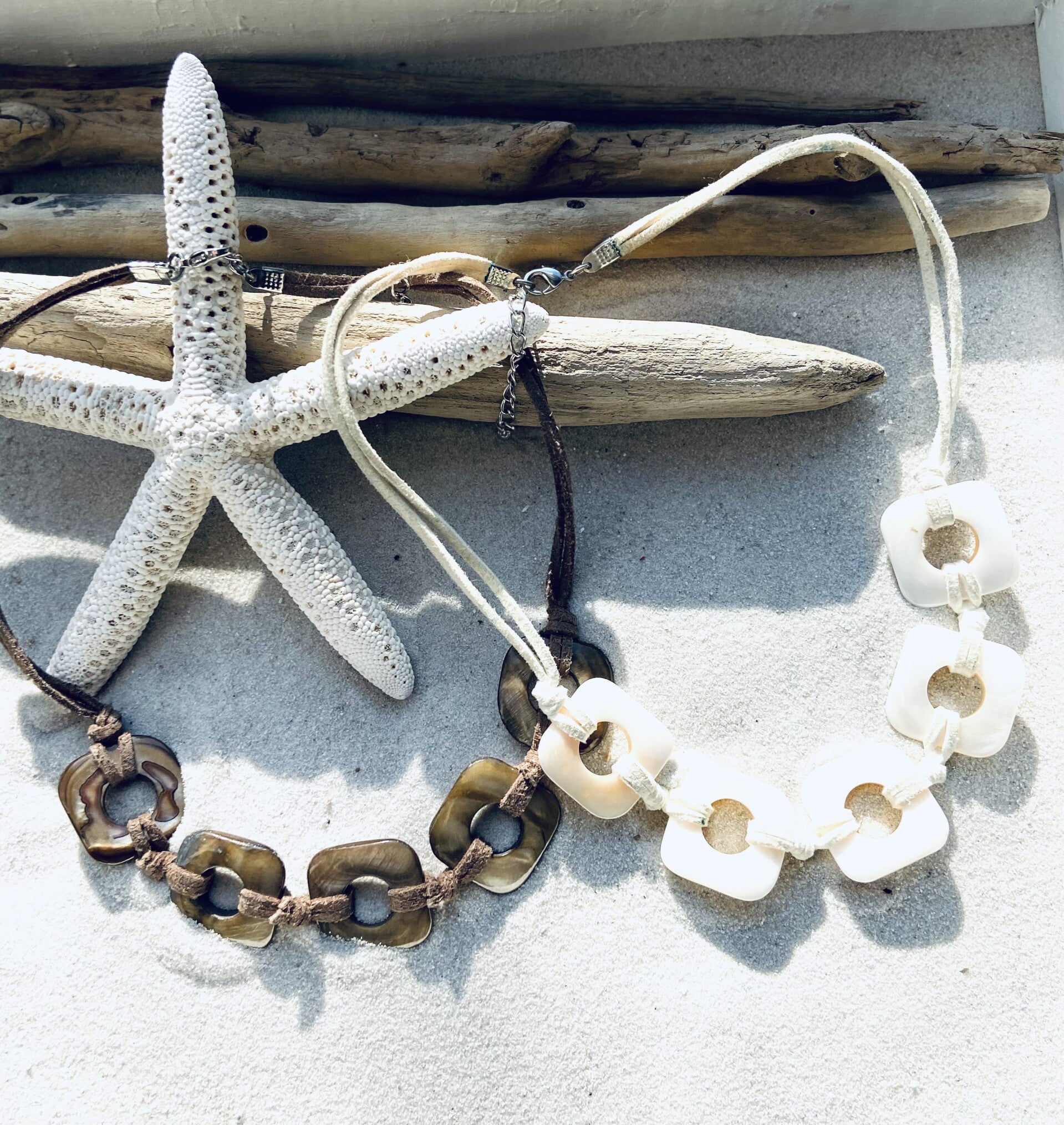 Parelmoeren schelpketting met 5 vierkante schelp-schakels + zilveren slotje.