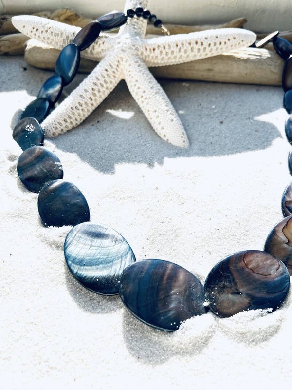 Grijze parelmoeren ketting met uitgehouwen schelpen-elipses + zilveren slotje.