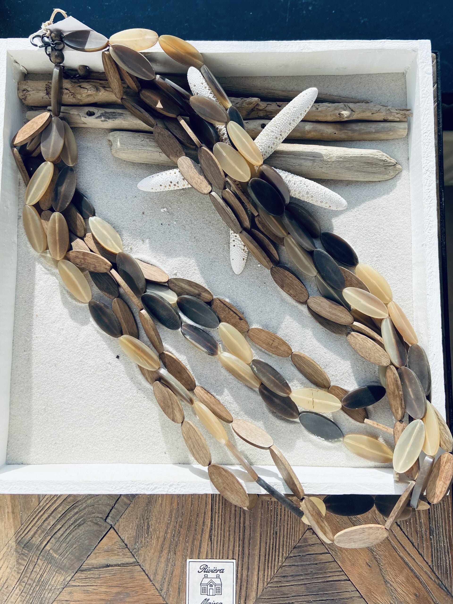 Exclusieve halsketting, handgemaakt uit Mauritsius. Deze bestaat uit meer dan honderd houten en schelpachtige elipsen.