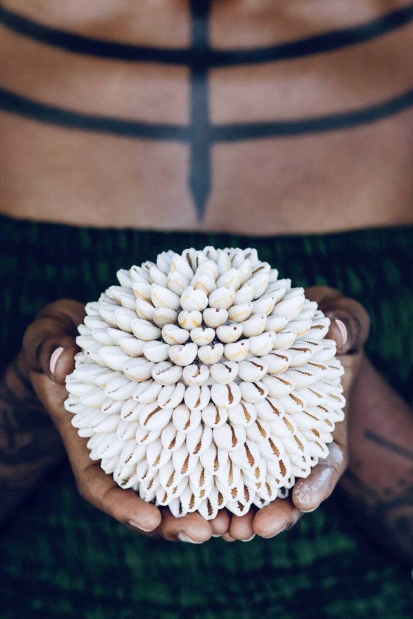 Prachtige handgemaakte schelpenbol uit Bali, bestaande uit honderden kleine Kauri schelpjes.