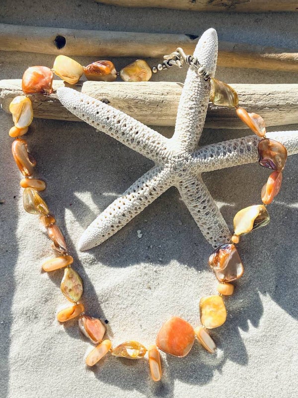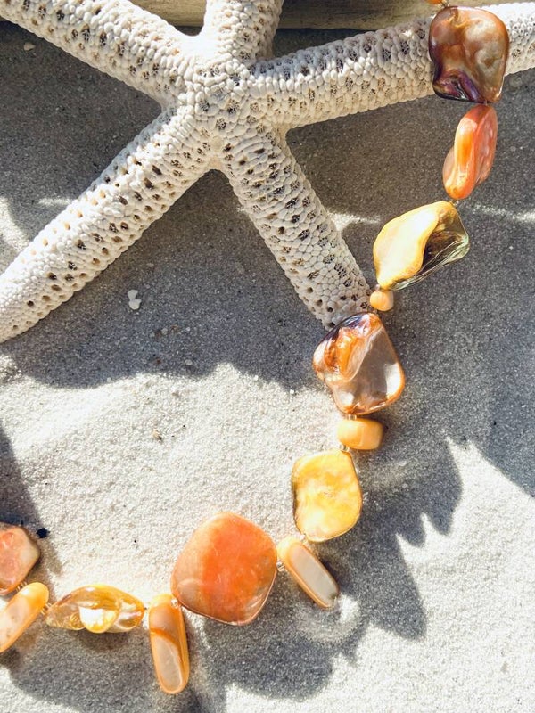 Prachtige IBIZA koraalkleurige set met parelmoersteentjes. Deze set omvat een prachtige halsketting + 2 oorbelhangers