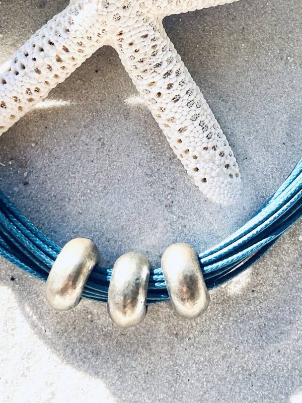 Deze strakke ketting is gemaakt uit turquoise surfkoord en 3 koperen kralen.
