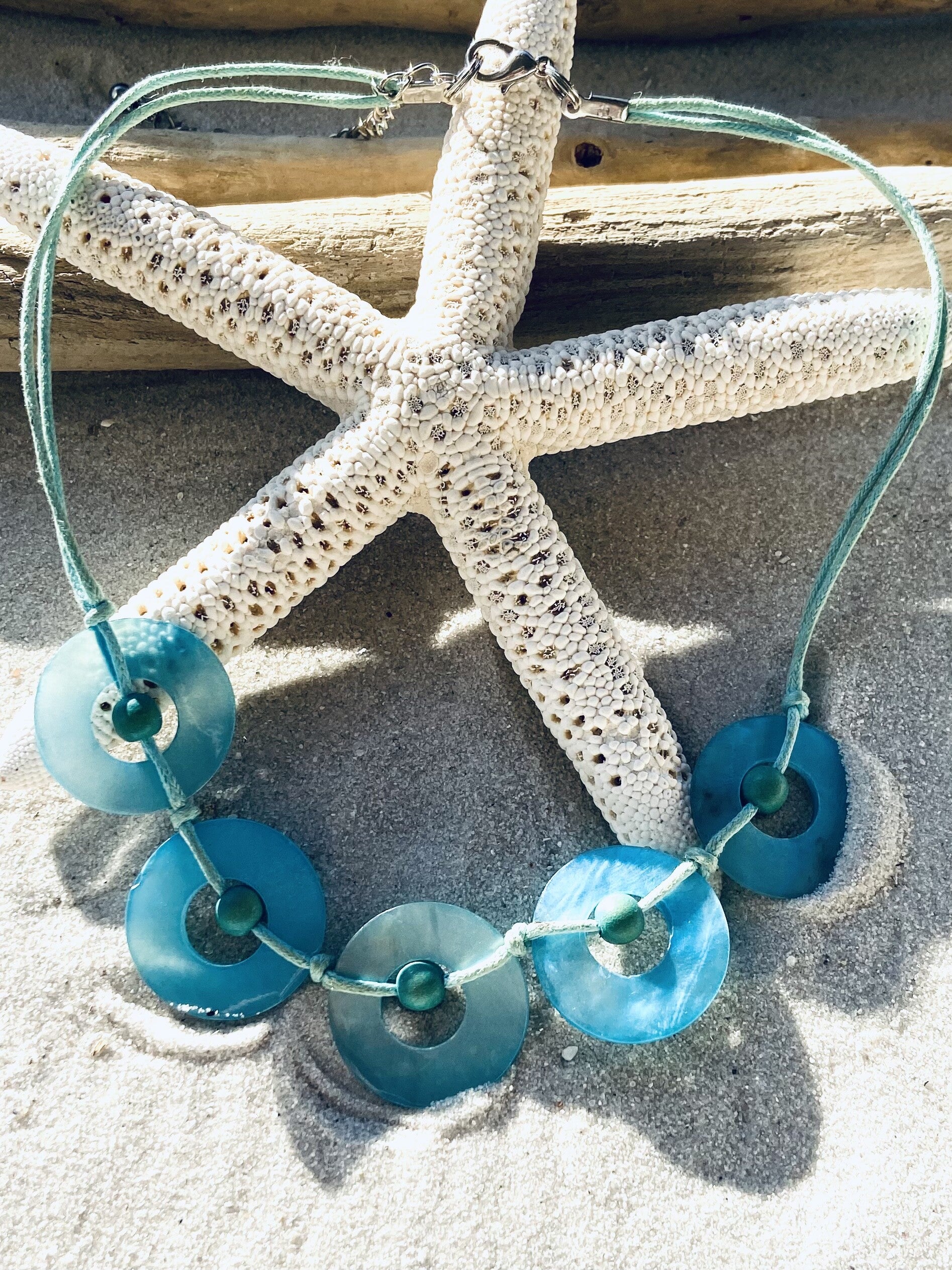 Korte blauwe schelpketting met 5 ronde parelmoerkleurige schelp-schakels + zilveren slotje.