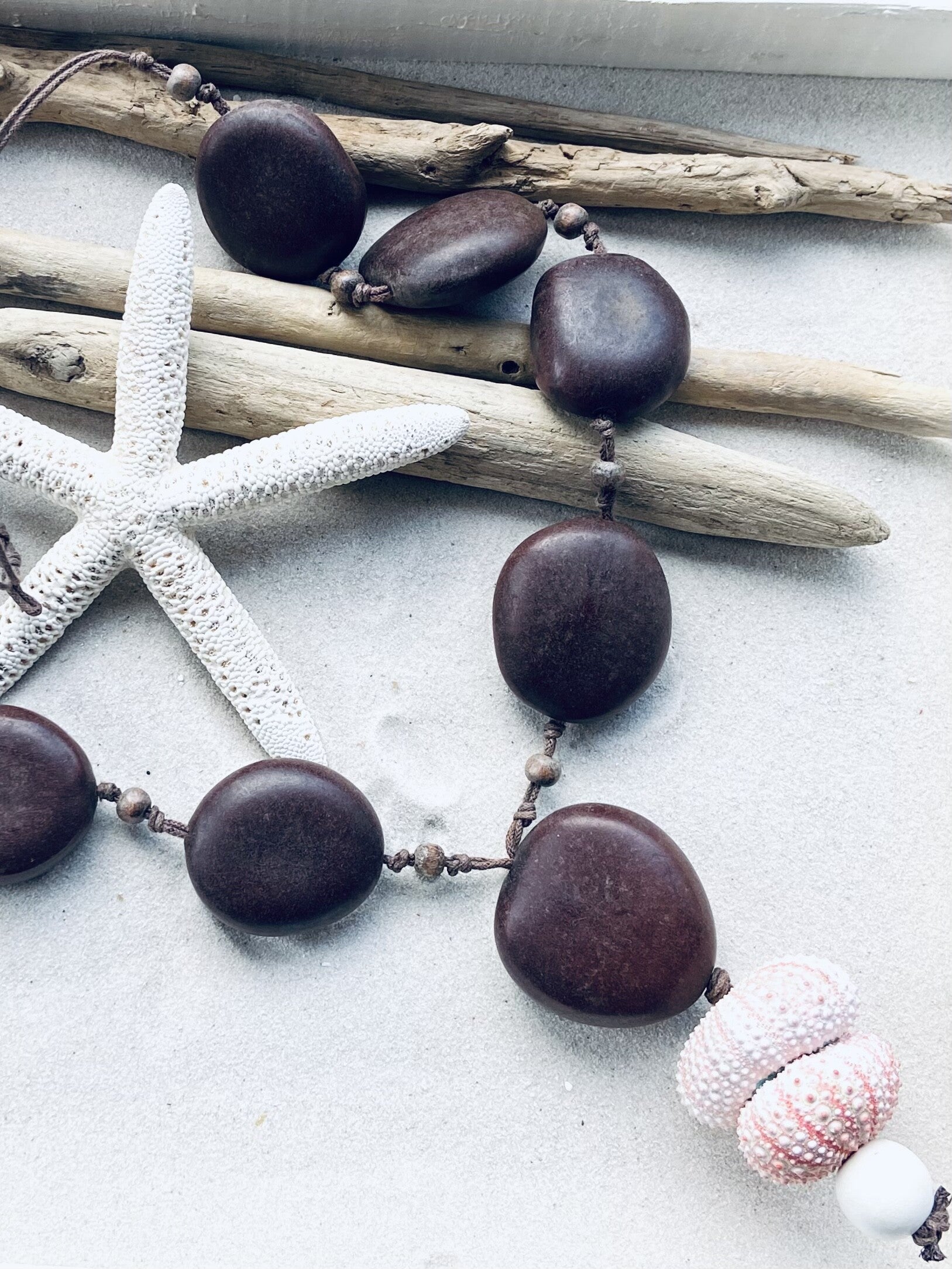 Prachtige handgeknoopte halsketting uit Senegal bestaande uit donkerbruine steenparels en 2 roze koraaltjes. Een echt ambachtswerkje op koord !