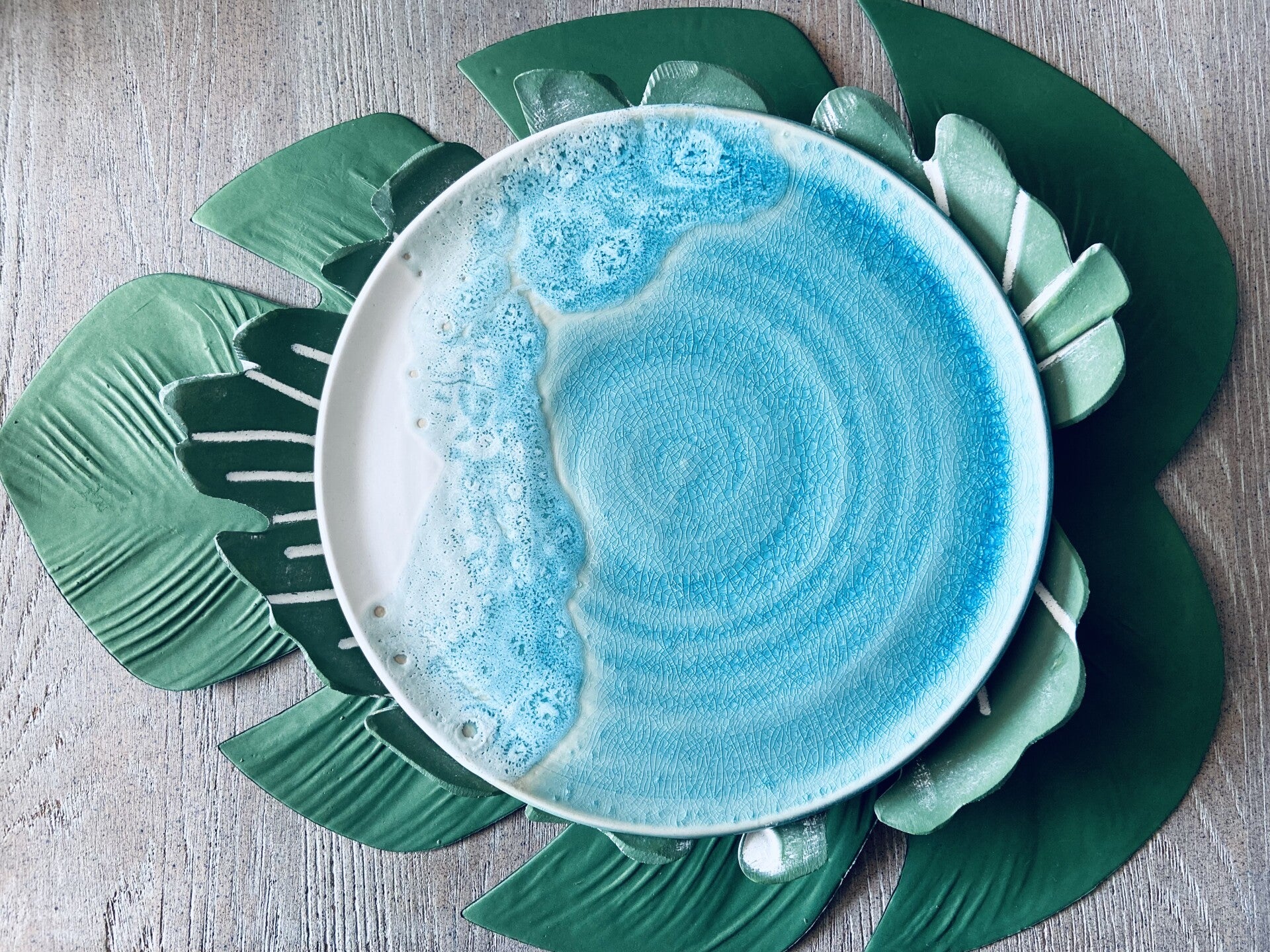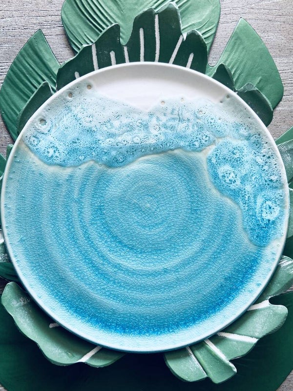 Deze organische (serveer)borden geven de golven weer die aanspoelen vanuit de subtropische zee op het witte strand van White Sand Beach aan de Oostkant van Bali. De glazuur geeft dit prachtige spel van eb en vloed weer, je kan het als het ware voelen, als je met je handen over de oppervlakte glijdt...
