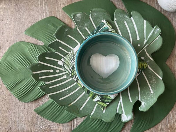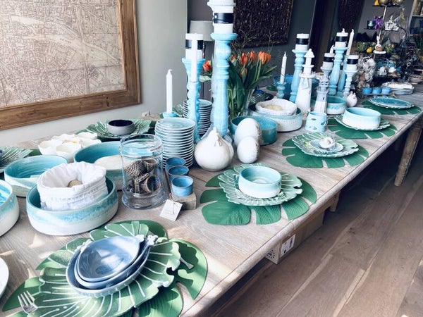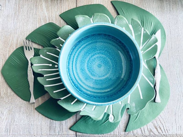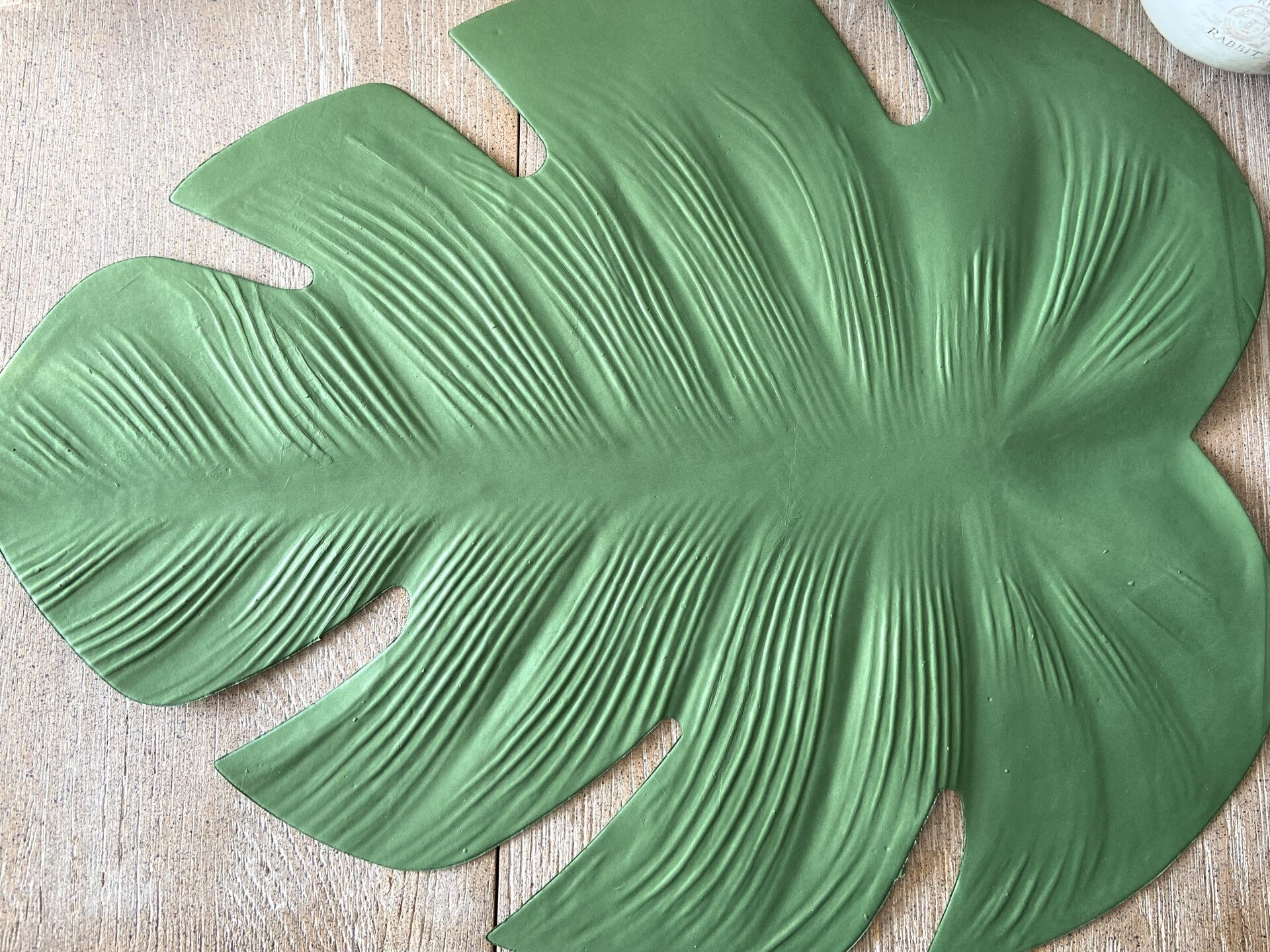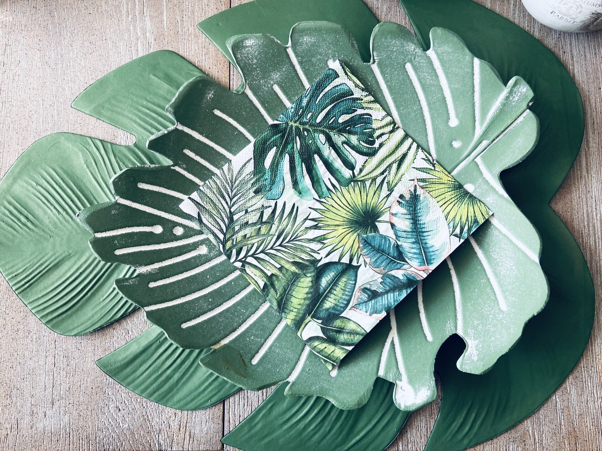 Prachtige grote groene houten onderschaal of onderbord + placemat in de vorm van een groot exotisch palmblad. Met deze collectie tover je een echte Carribian sfeer tijdens uw etentjes en feestjes !