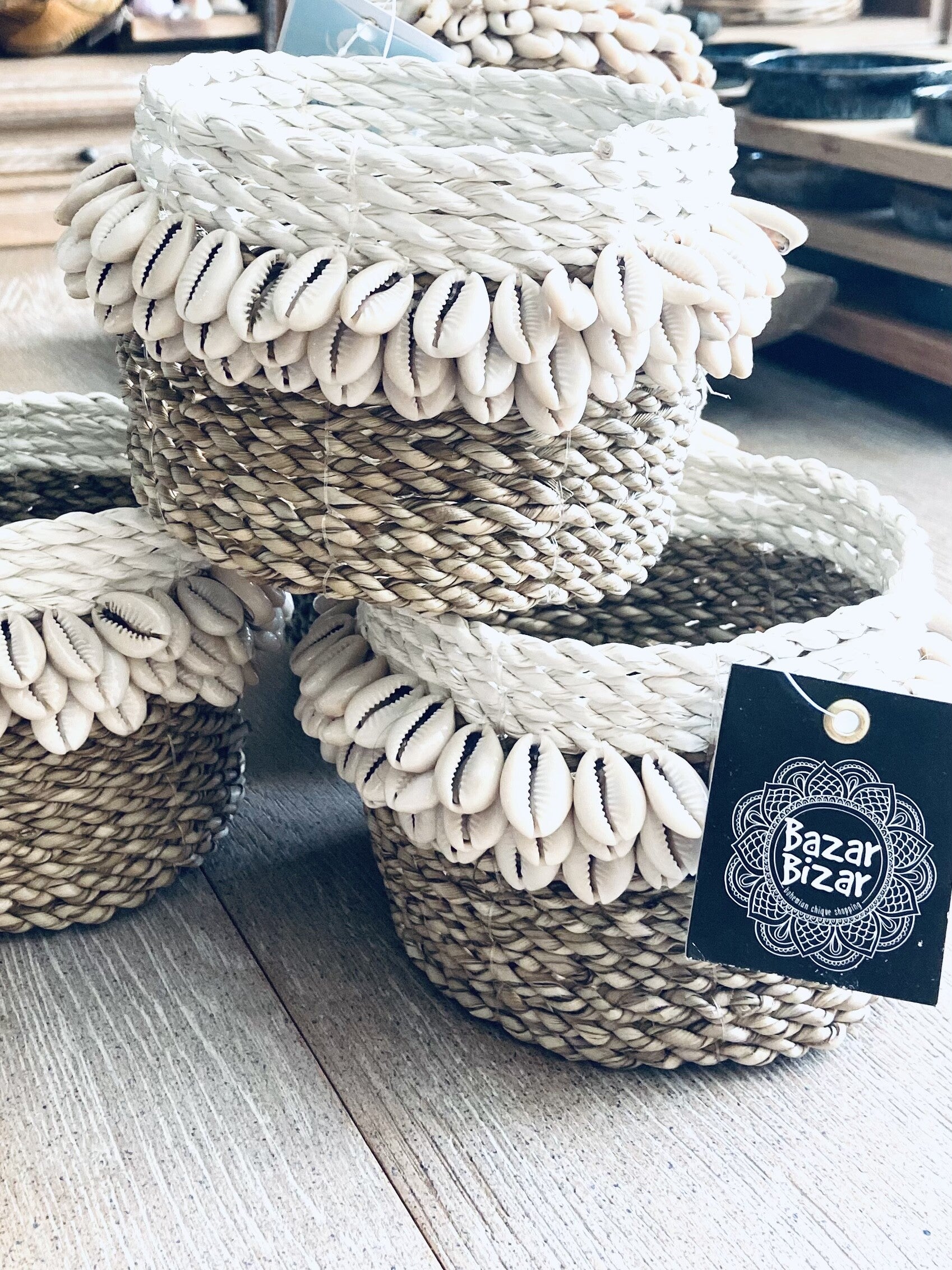 Zalig mooi handgewoven zeegras mandje met witte Kauri schelpen. Dit handige mandje kan je overal gebruiken, voor het wegbergen van toiletgerief, make-up, papierwaren... Ook gewoon mooi om ergens te zetten als BOHO decoratie met Ibiza of Bali vibe !