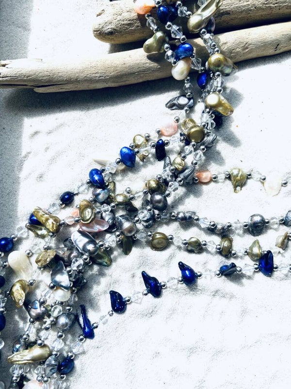 Prachtige parelmoeren lange kettingen met zoetwaterparels; deze zijn rijstkorrels gekweekt in oesterschelpen in Indonesië. Holaz verkoopt ze in allerlei kleuren, afmetingen en lengtes !