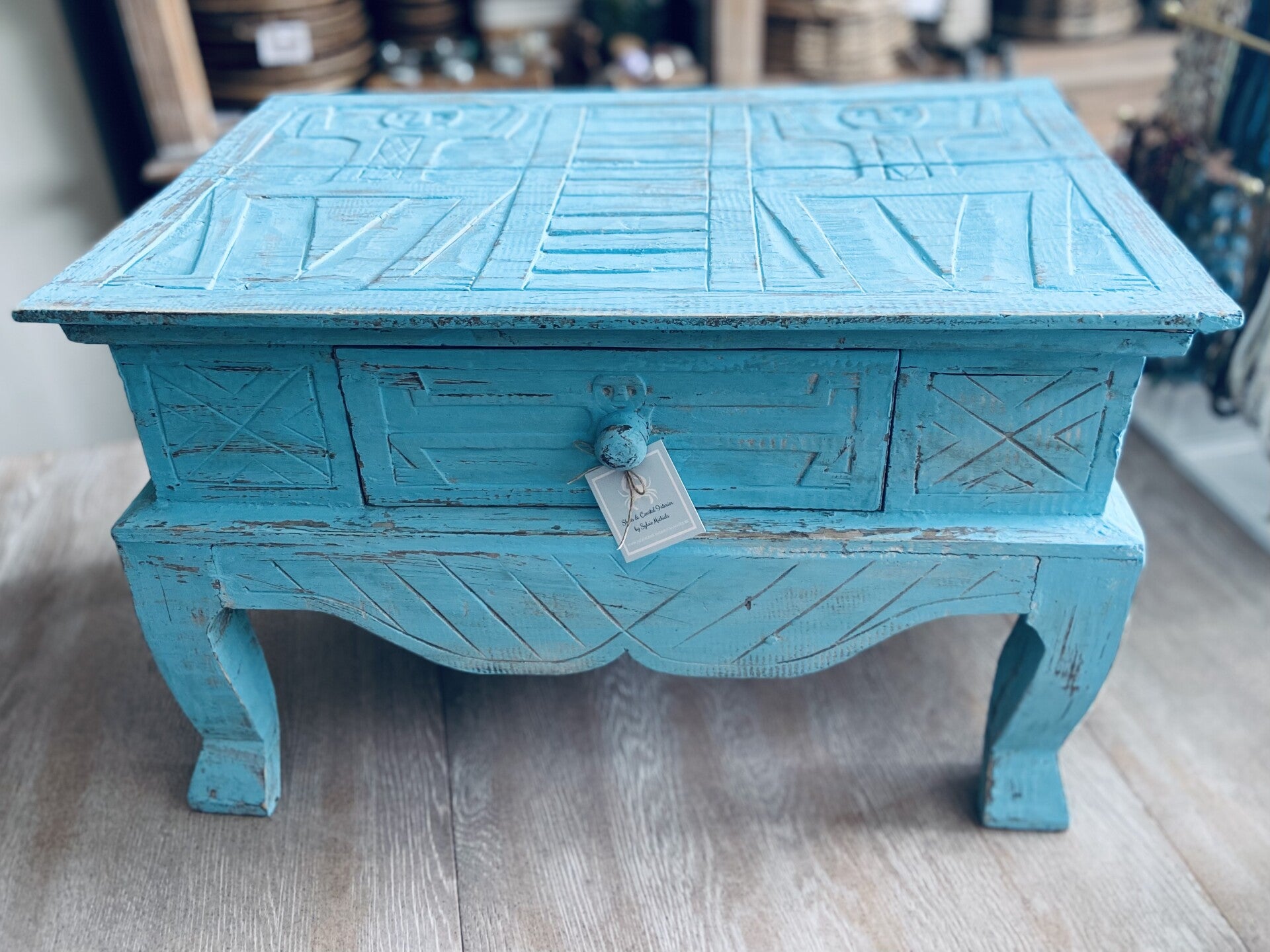 Prachtig turquoise houten Ibiza meubeltjes, kom ze bekijken in onze conceptstore en op onze opendeurweekends !
