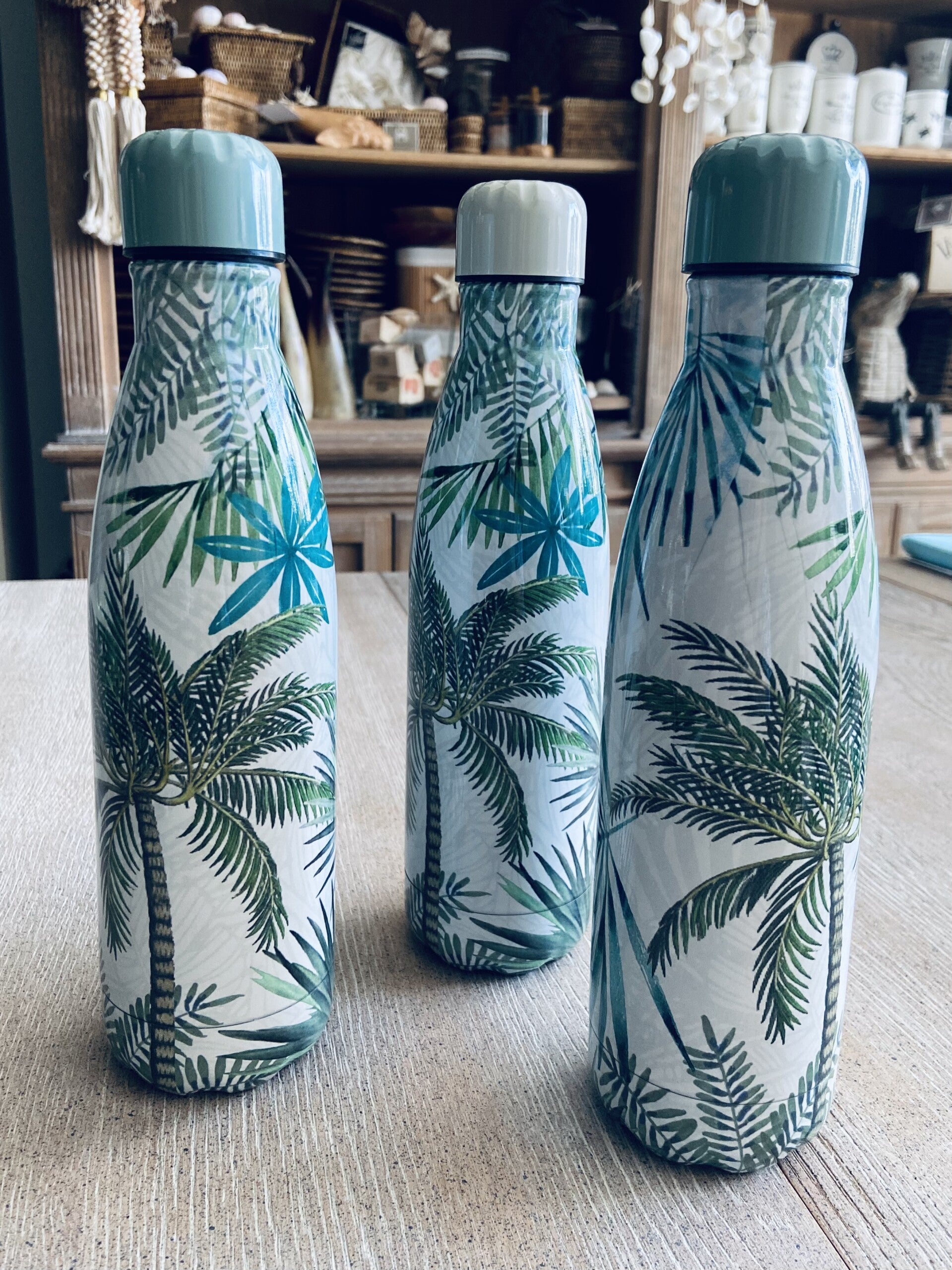 Roestvrije thermofles met palmbomenprint. Ideaal om overal mee te nemen, lekt niet.