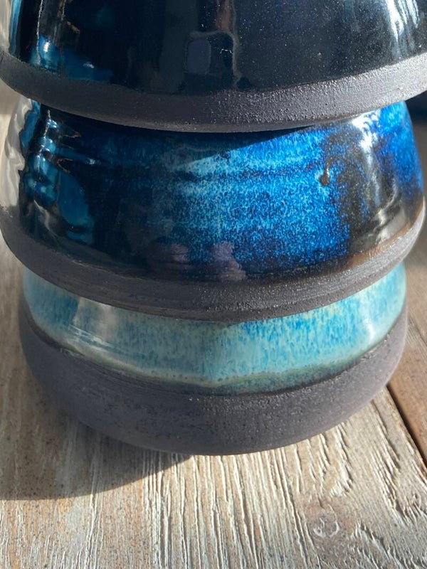 Prachtige Japanse gedraaide keramiek schaaltjes in zwarte klei, ideaal voor sushi of tapas. De schakeringen van de blauwe glazuur zijn zo knap, helemaal ocean ! Ook de speciale vorm maakt ze extra uniek.