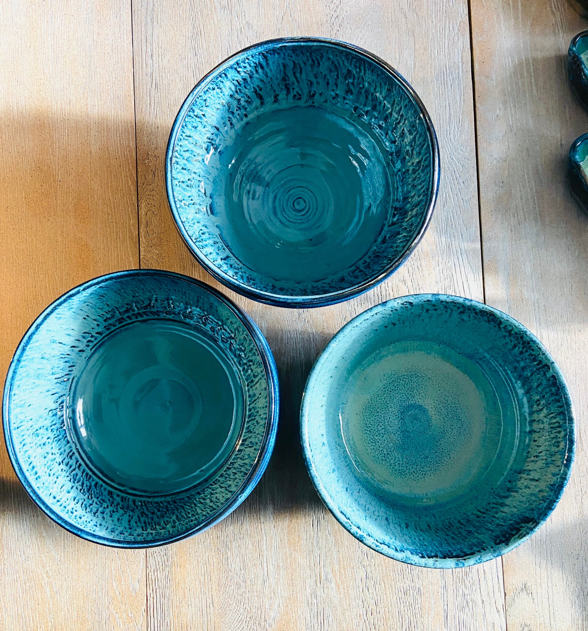 Enorm knappe XL blauw-turquoise kommen om al uw gerechten in te serveren ! Ze hebben maar liefst een diameter van 30 cm !!! De hoogte varieert van 13cm tem 15cm. Deze zijn op en top Holaz !