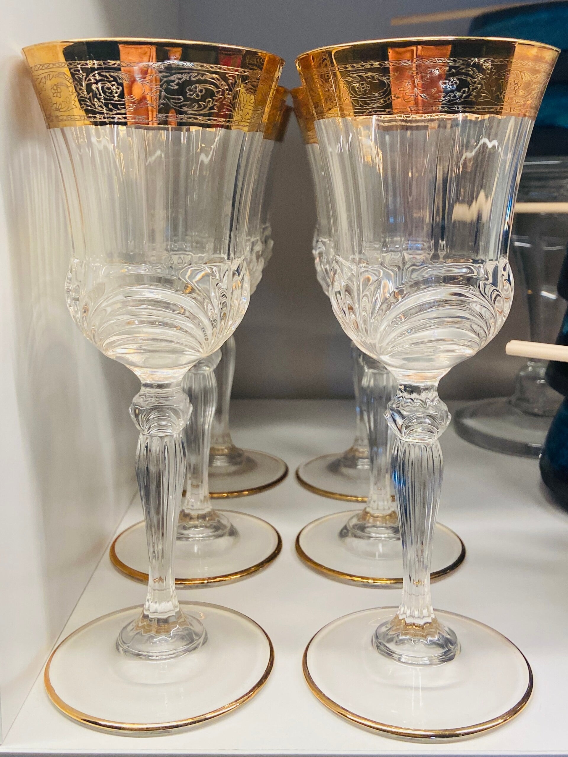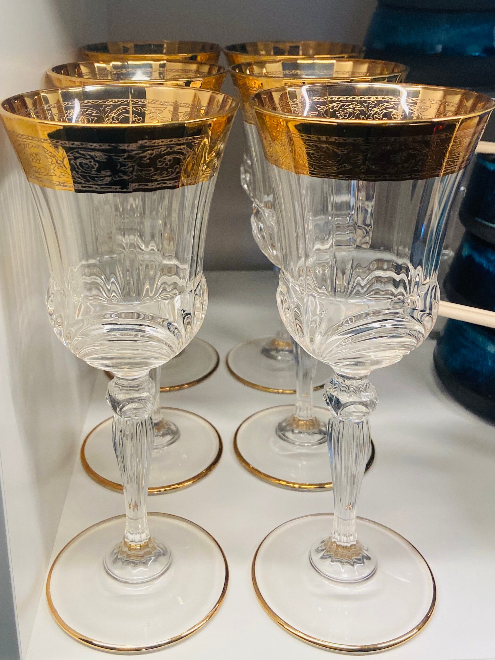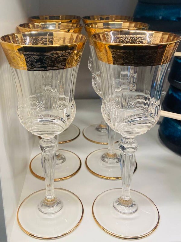 Koninklijke geslepen kristallen wijnglazen met gouden randje, zwaar model. HOLAZ verkoopt een set van 6 stuks witte en 6 stuks rode wijnglazen. Ze zijn ongelooflijk prachtig !